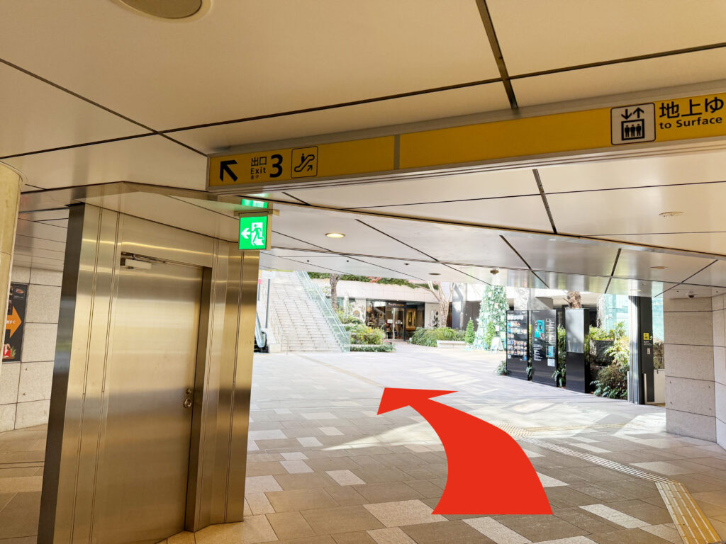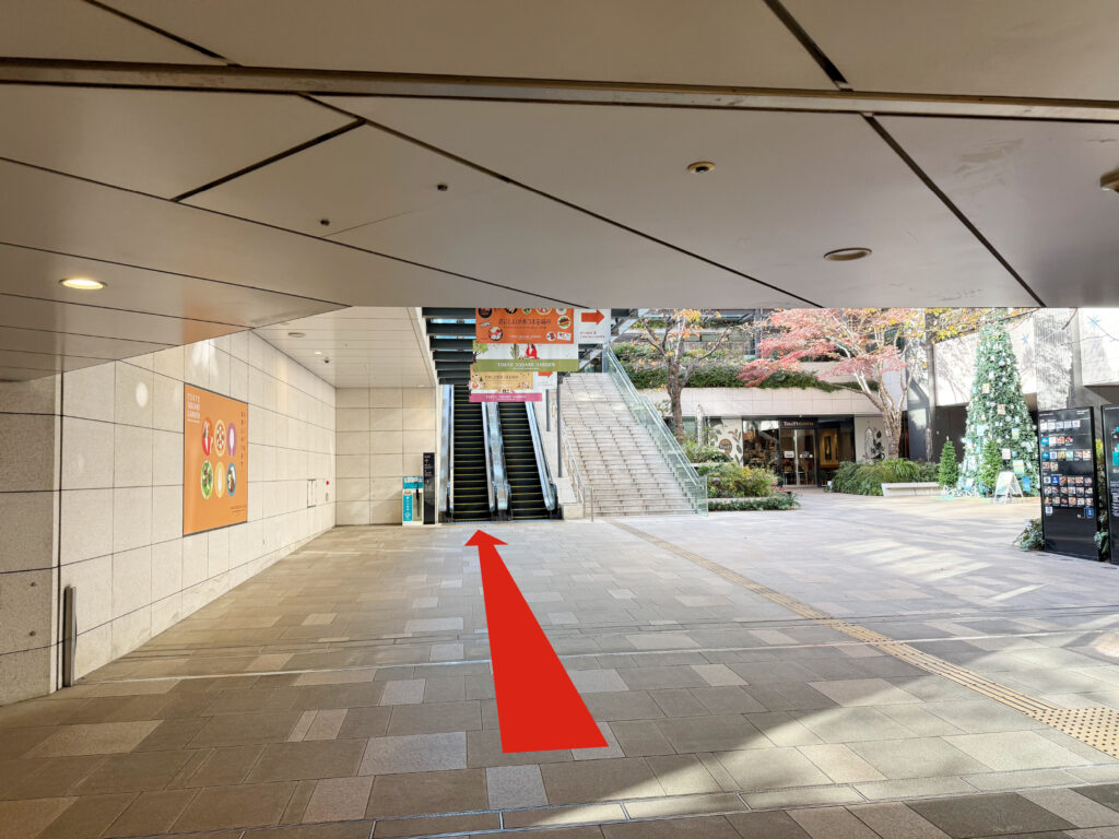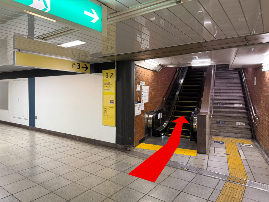 エスカレーターがありますのでこちらを上り、地上に出ます。