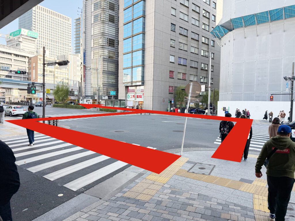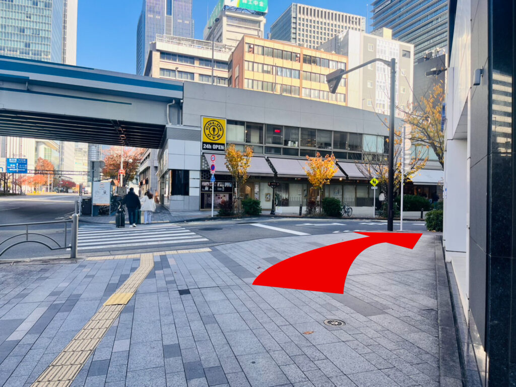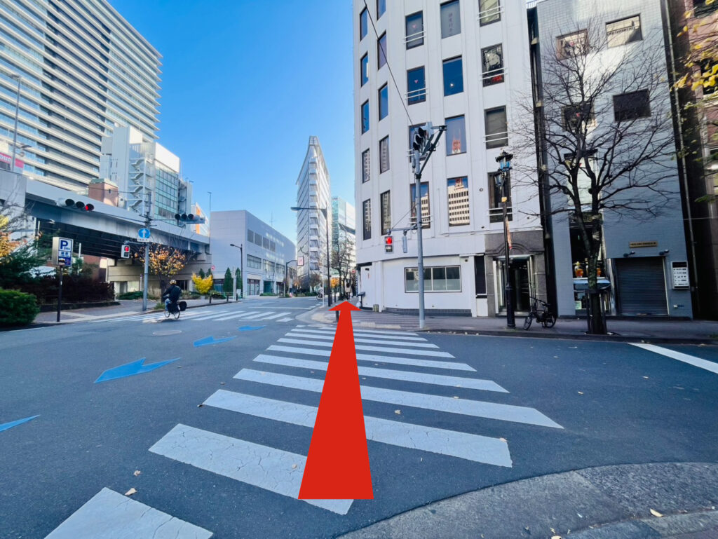 銀座INZ2とINZ3の間、高架をくぐりますと交差点にさしかかりますので、渡りまして奥の歩道
