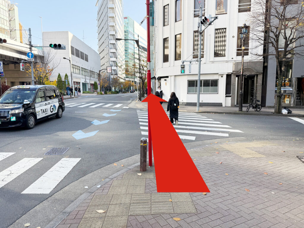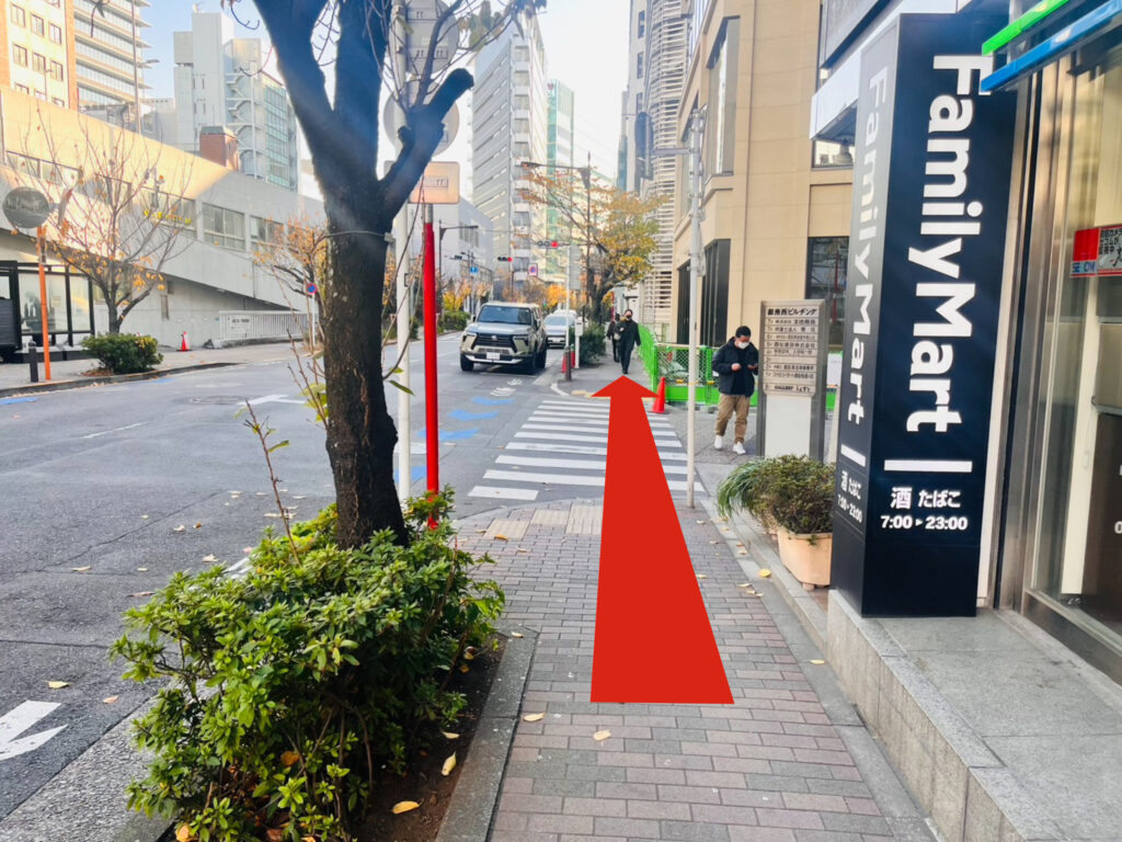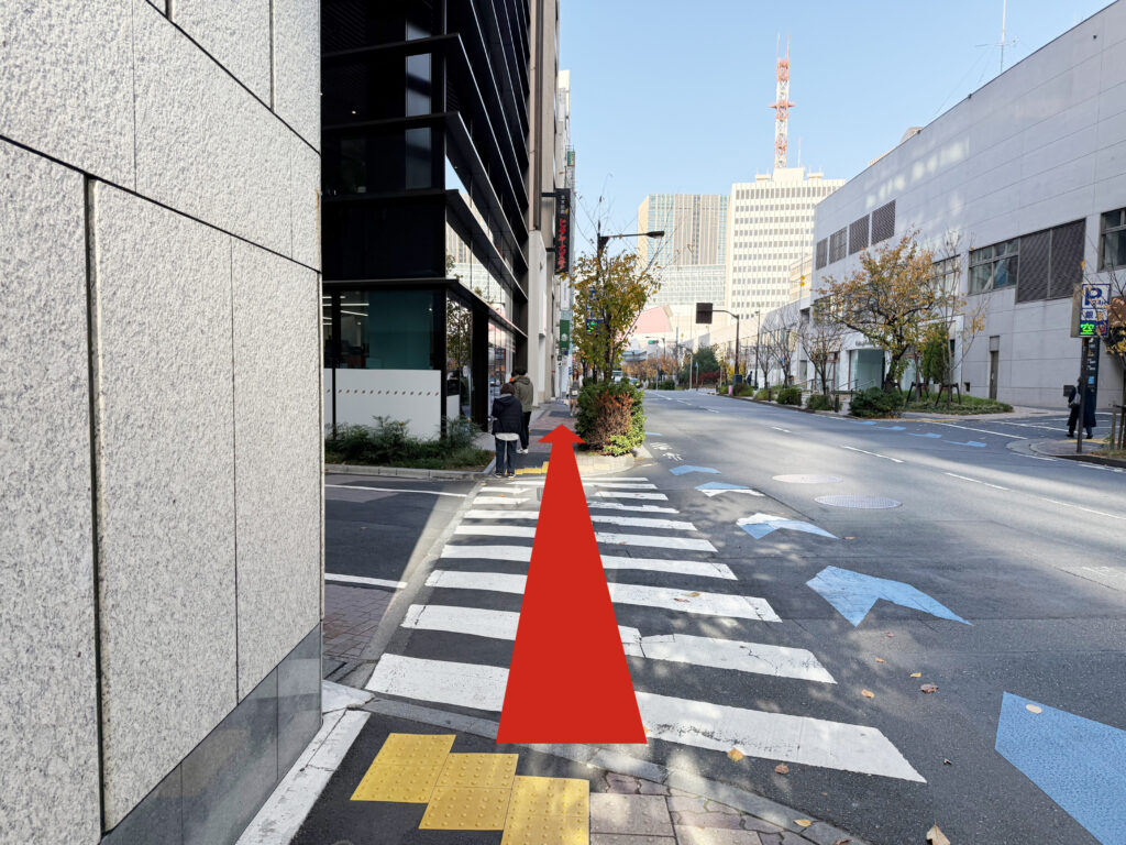 地上に出ましたら、すぐ左に歩道がありますのでそのまま向かって右手に真っ直ぐ進みます。